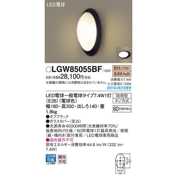 LGW85055BF パナソニック LEDポーチライト 塩害地向け仕様 電球色