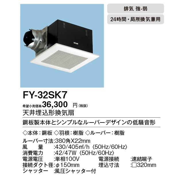 FY-32SK7 Panasonic 天井埋込形換気扇 ルーバーセット 大風量形 強・弱速調付 トイレ・洗面所、居室・廊下・ホール・事務所・店舗用 低騒音形 400立方m/h