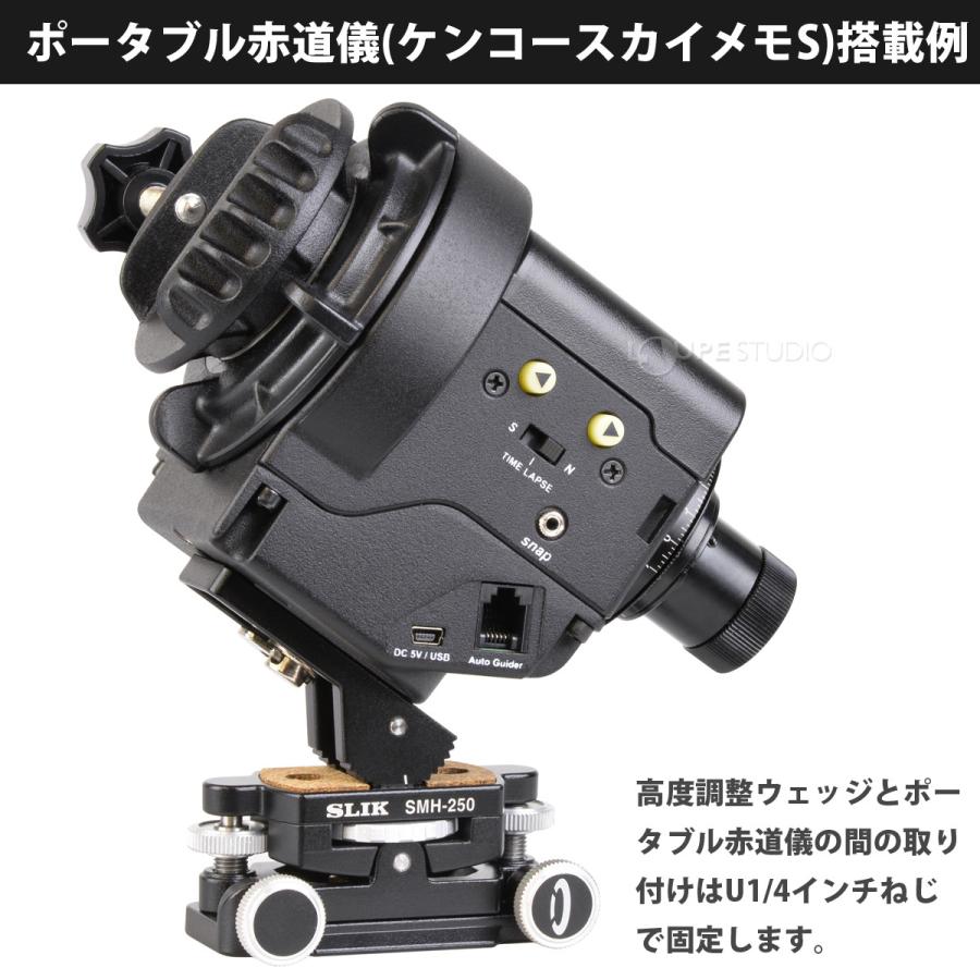 高度微動角度度度方位微動角度度度微動方式押しねじ式ノブ回転で度微動の軸微動雲台高度補助ウェッジが付属サイズ最大搭載荷重サイズ重量高度微動角度方位微動角度雲台取付ネジ三脚取付ネジ 商品の仕様詳細はこちら 微動雲台 スリック ビデオカメラ ビデオ カメラ 三脚 カメラアクセサリ おすすめ 撮影詳細 微動雲台 高度微動角度度度方位微動角度度度微動方式押しねじ式ノブ回転で度微動の軸微動雲台です高度補助ウェッジが付属 ポタブル赤道儀を搭載する際は高度補助ウェッジ装着状態のを三脚に直接取り付けて使用しますフィルドスコプを搭載する際は高度補助ウェッジを取り外したを雲台に載せて使用しますその際微調整を雲台側ではなくで行います 三脚雲台への取り付けはカメラネジの他アルカ互換シュベスに直接固定することもできます 搭載する機材はカメラネジにて取り付けます イメジ イメジ 着脱式の高度調整ウェッジが付属 ポタブル赤道儀ケンコスカイメモ搭載例 高度調整ウェッジ付属の取り付けネジは蝶ネジ式 方位調整ノブ 高度調整ノブ アルカ互換シュベスに直接固定も可能