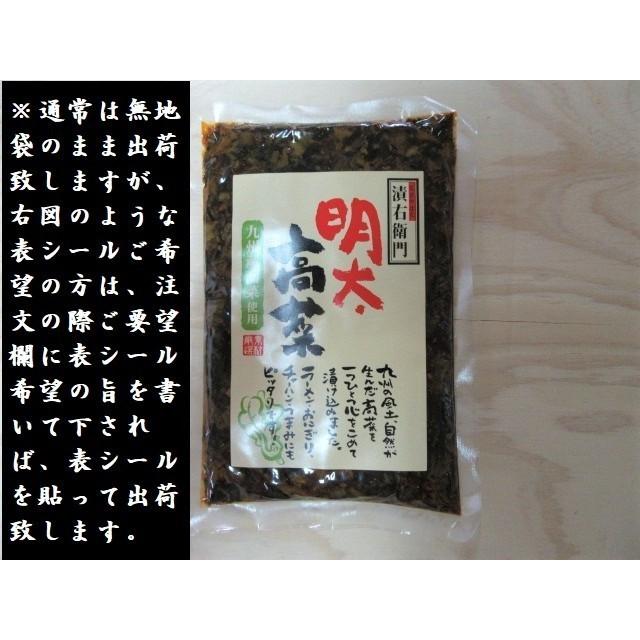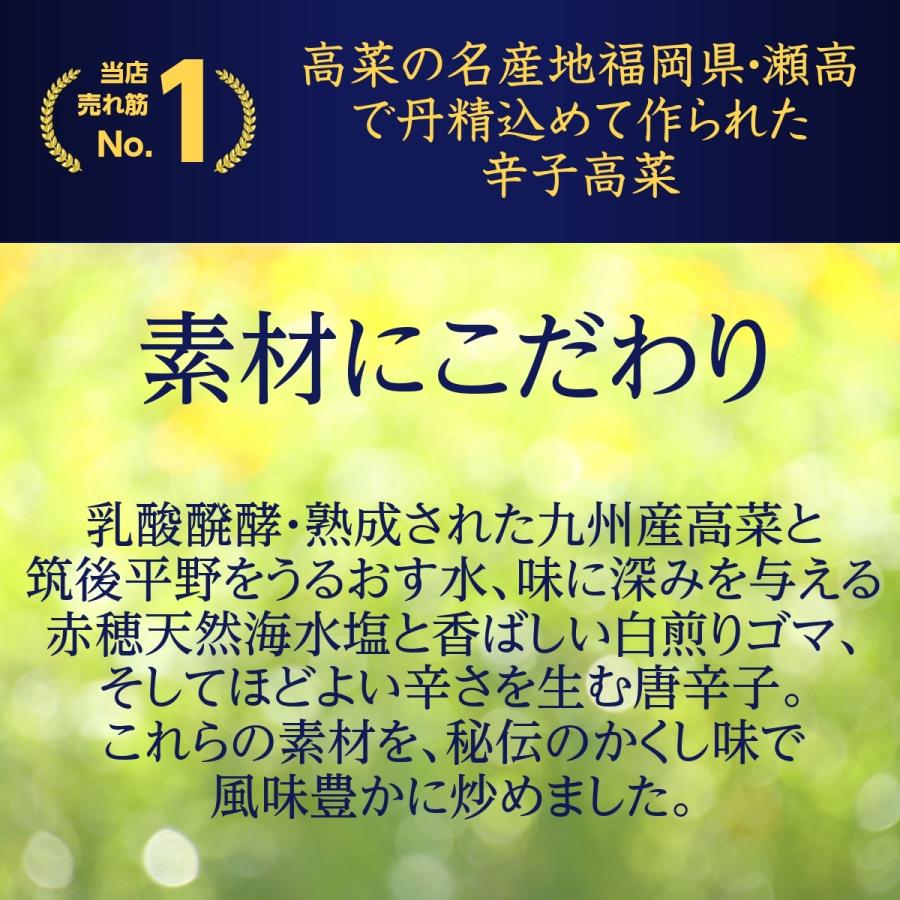 大量パックですので表は無地のまま出荷させて頂きます表シルご希望の方は注文の際ストアへのご要望の箇所に表シル希望の旨を書いて頂ければ表シルを貼った状態で出荷させて頂きます九州産の刻み高菜に唐辛子や明太子を加え丁寧に油炒めした当店自慢の看板商品です合成着色料合成保存料は使用していません絶妙な味わいは全国の皆様に喜ばれていますぜひご賞味下さい辛子明太高菜内容量原材料名高菜九州産植物油たん白加水分解物食塩辛子明太子砂糖唐辛子ごま醤油醸造酢ウコン調味料アミノ酸等ソルビットトレハロス発色剤亜硝酸一部に小麦大豆ゼラチンごまを含む賞味期限日 保存方法直射日光高温多湿を避けて保存して下さい 開封後は冷蔵庫で保存しなるべく早めにお召し上がりください製造者旭食品工業株式会社 福岡県みやま市瀬高町長田