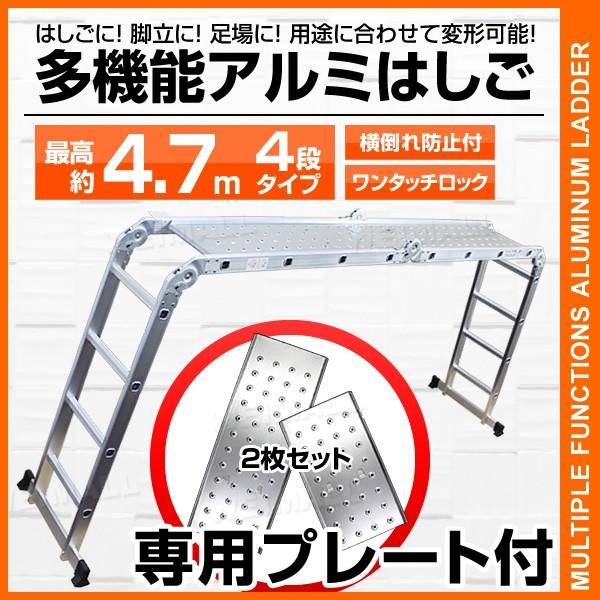多機能 はしご アルミ 脚立 作業台 足場 伸縮 梯子 ハシゴ 4段 4.7m 折りたたみ式 専用プレート2枚付 伸縮はしご